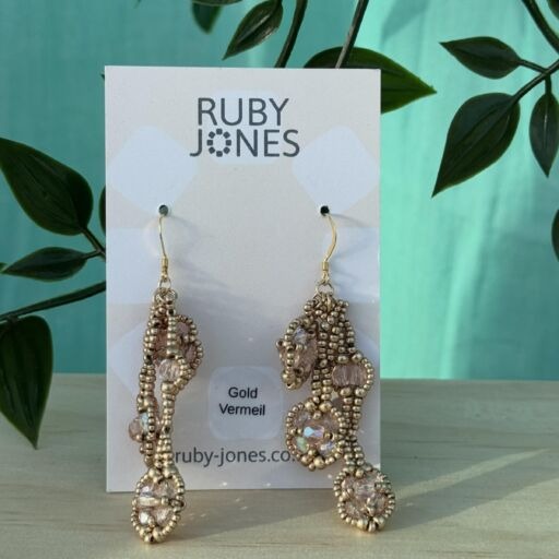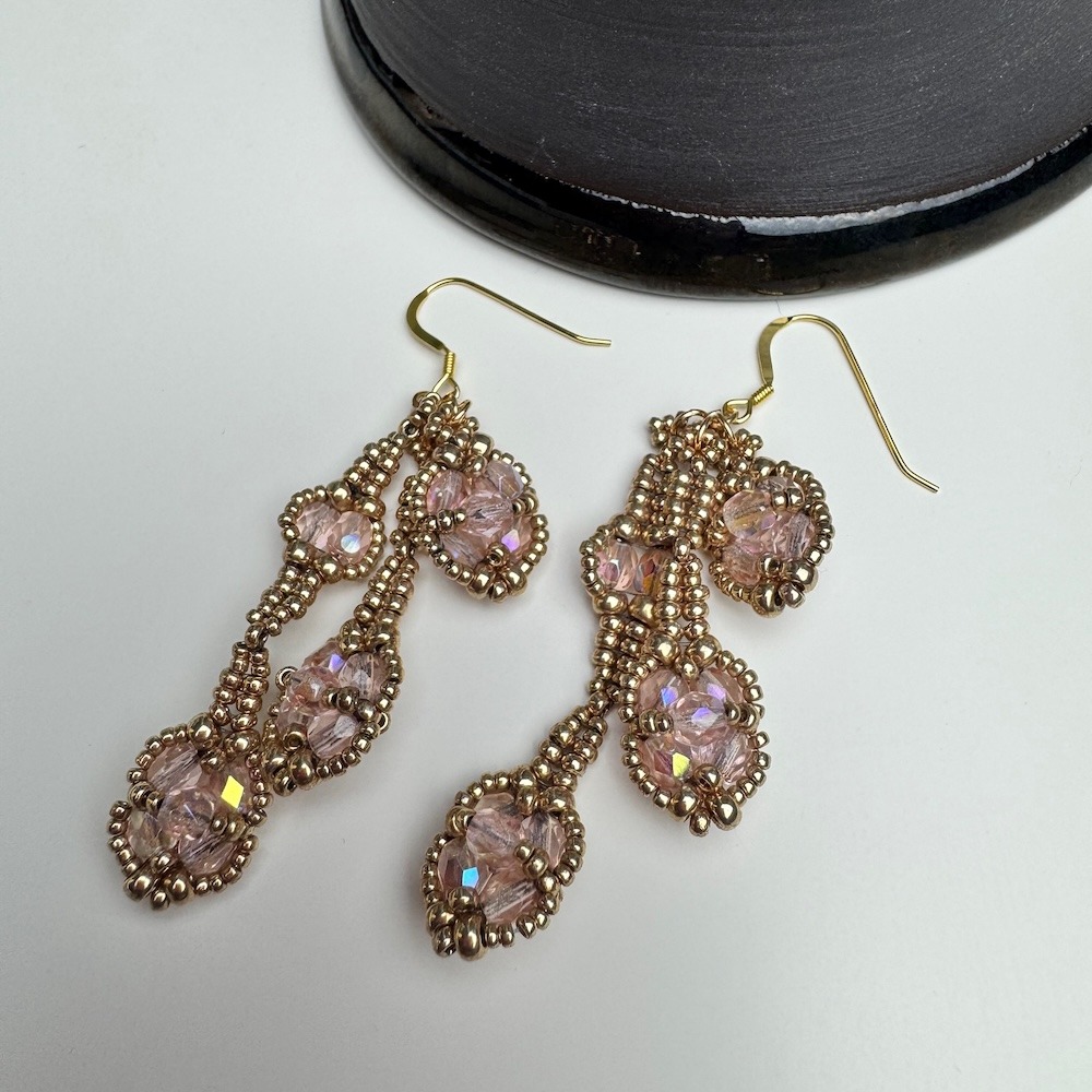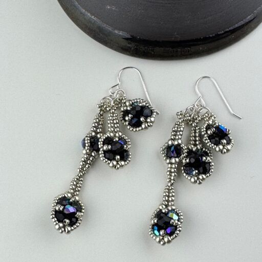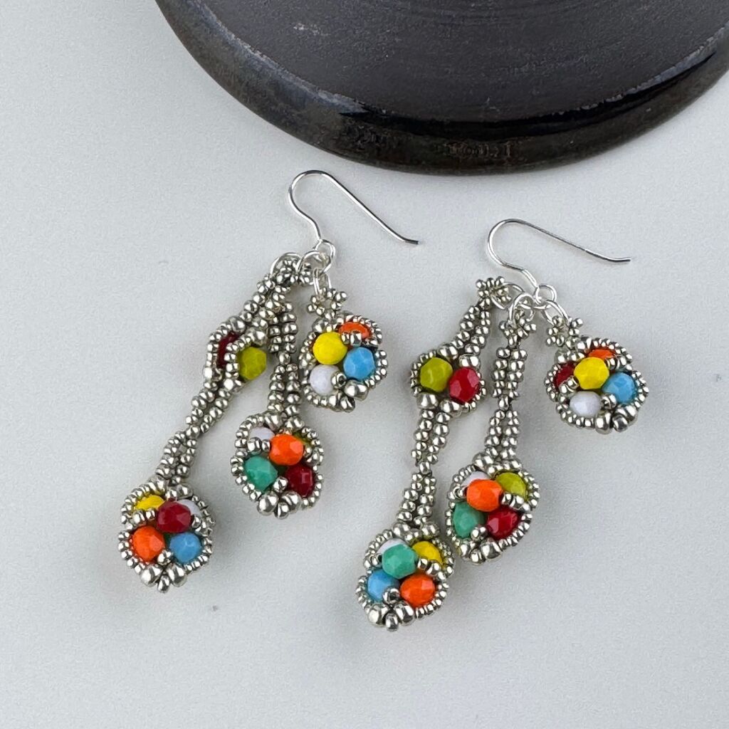 Multi drop fun earrings in a textured design with Czech crystals and seed beads.