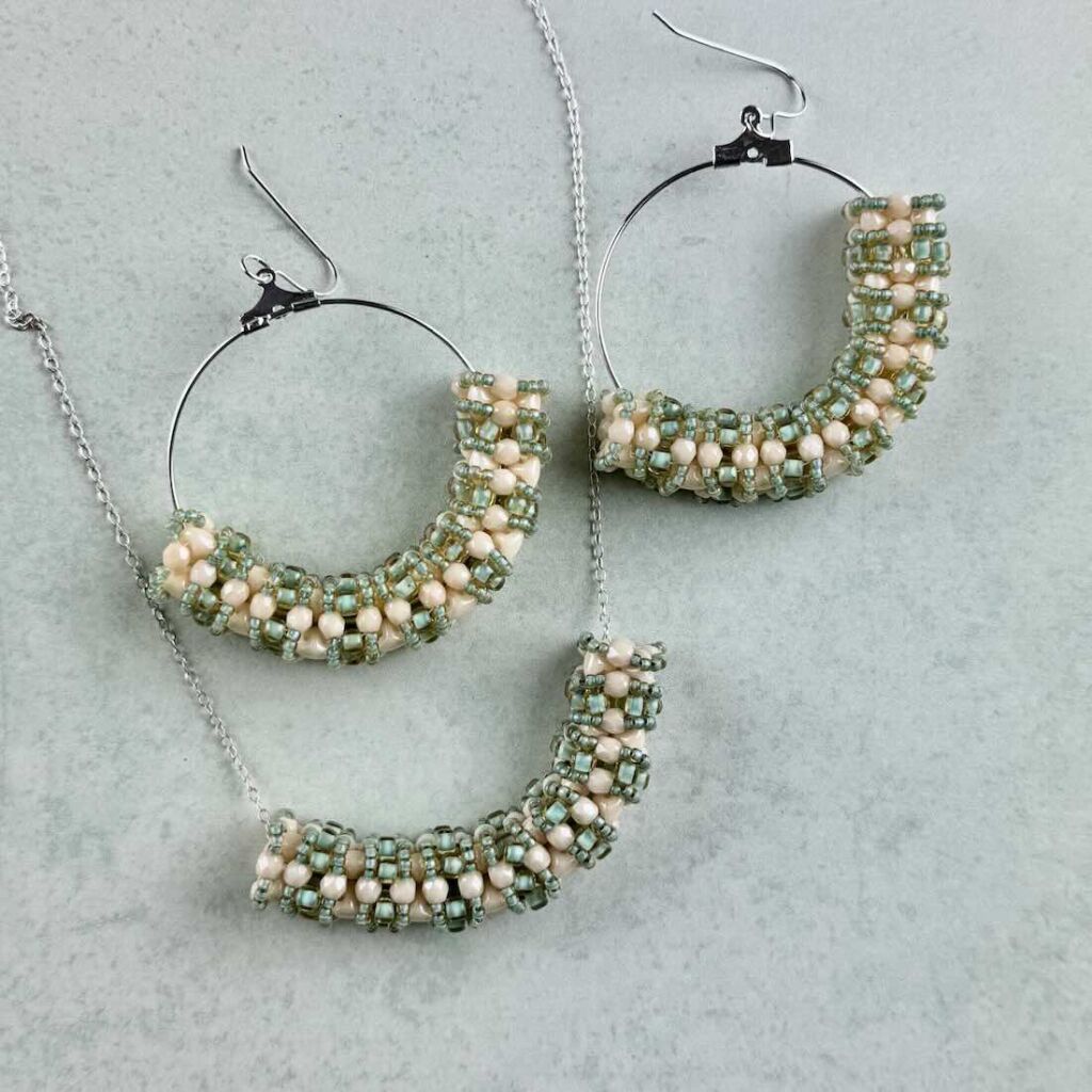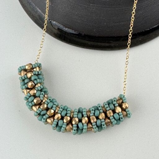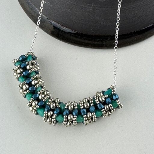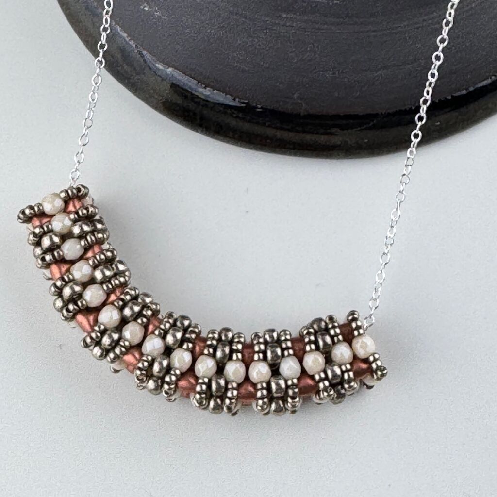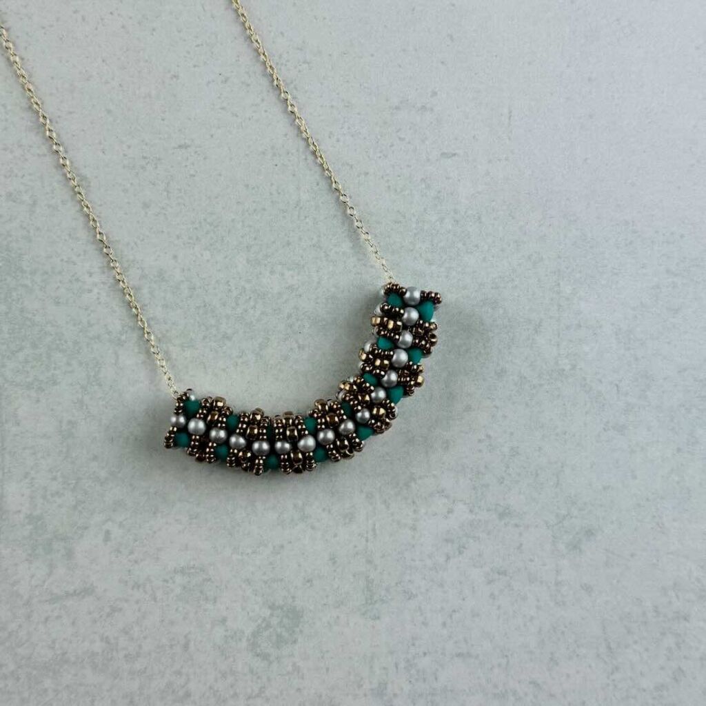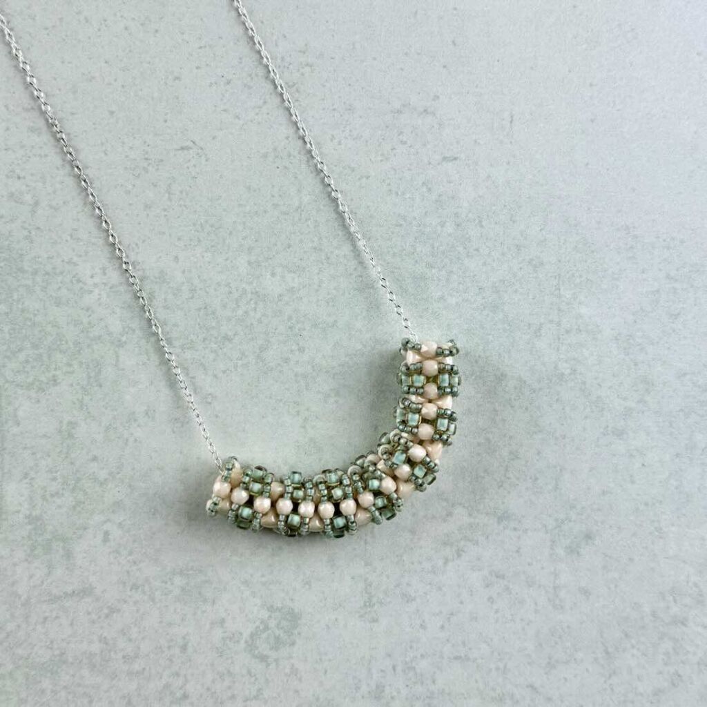 Stylish, simple beadwoven necklace, draped on delicately chain.