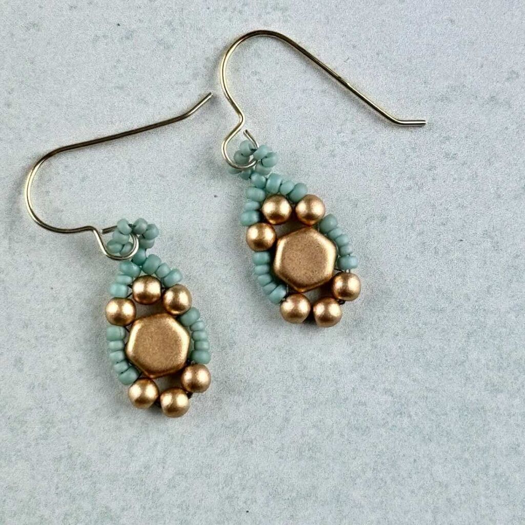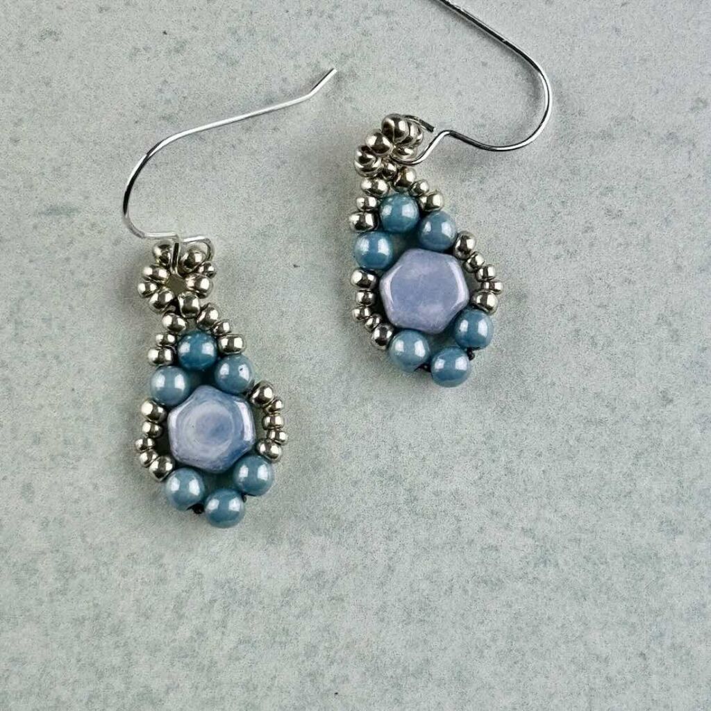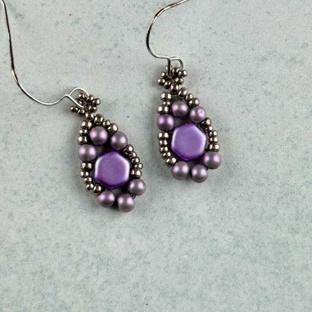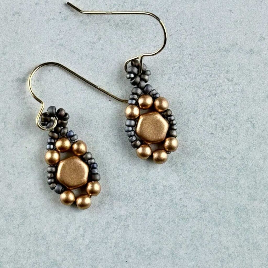 Delicate beadwoven earrings featuring a honeycomb shaped central bead with pearls.