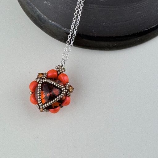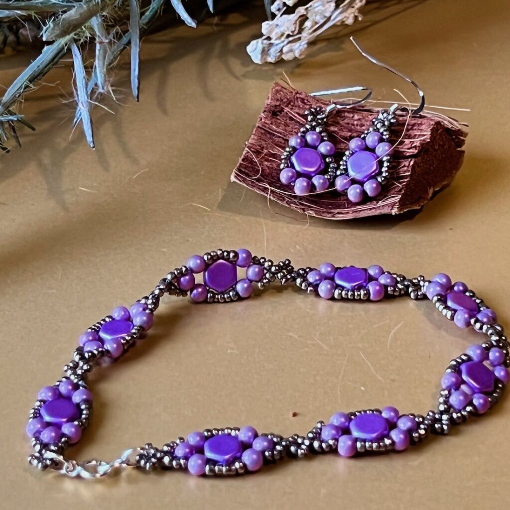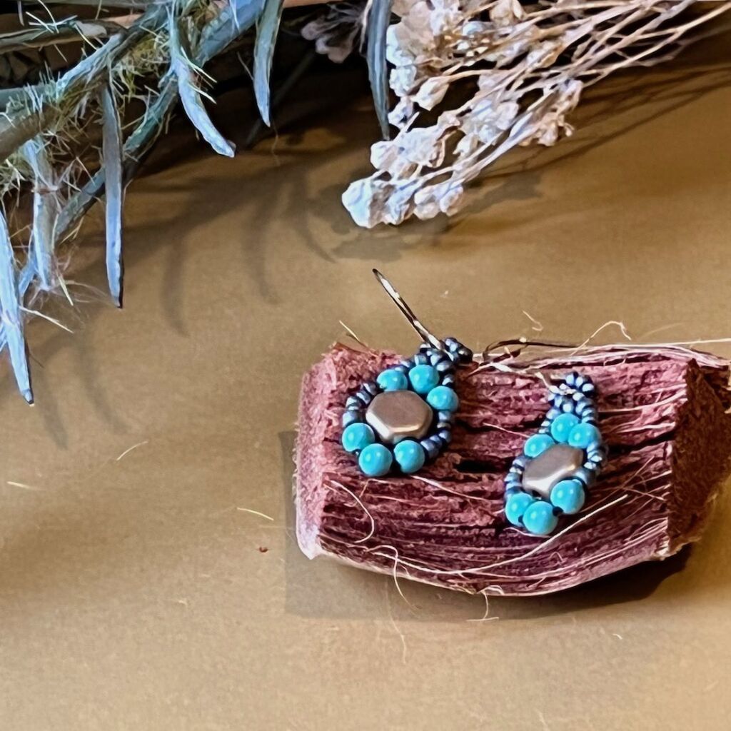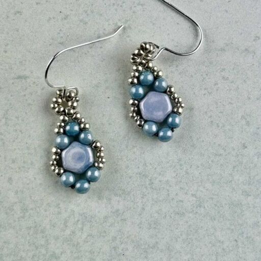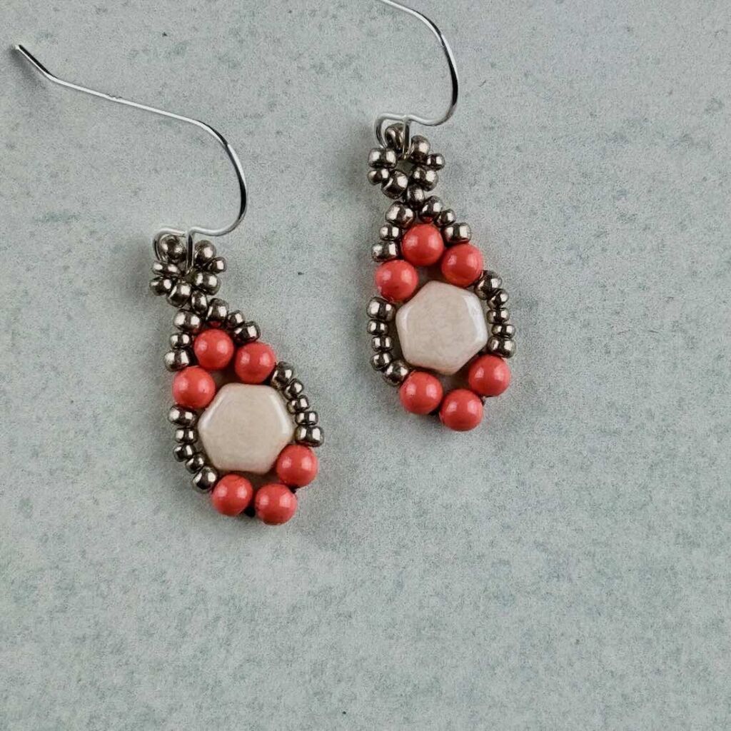 Delicate beadwoven earrings featuring a honeycomb shaped central bead with pearls.