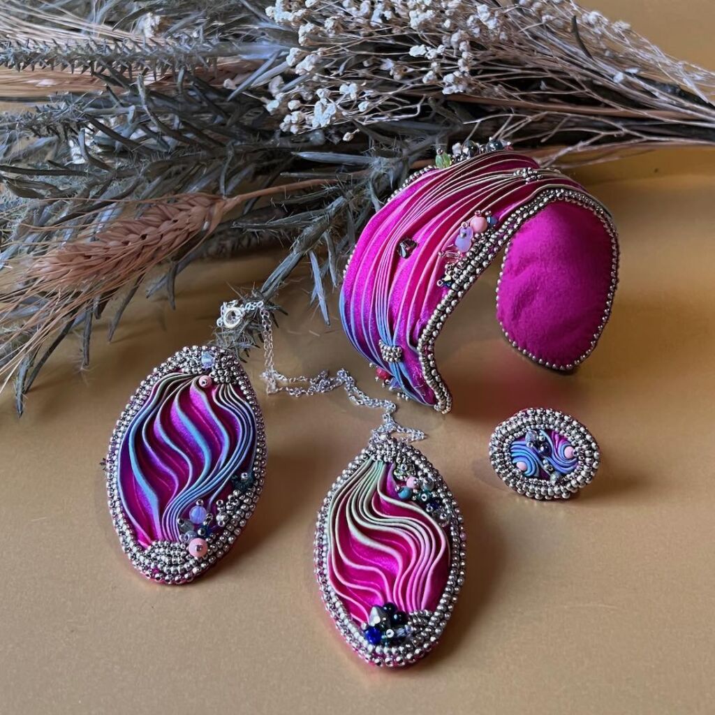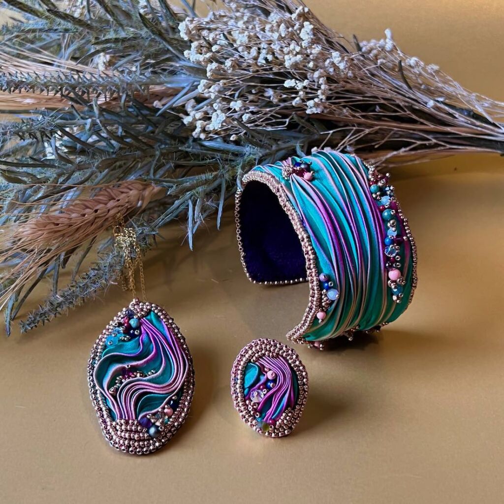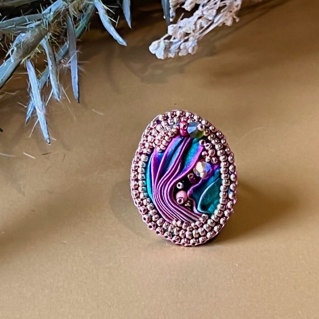 One of a kind bead embroidered dress ring featuring hand-dyed Shibori Silk embellished with seed beads, crystals and pearls.