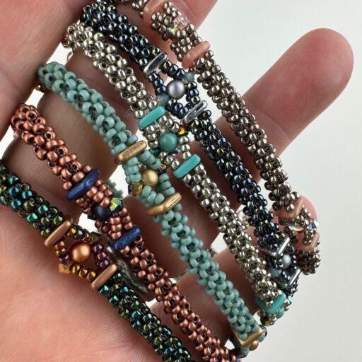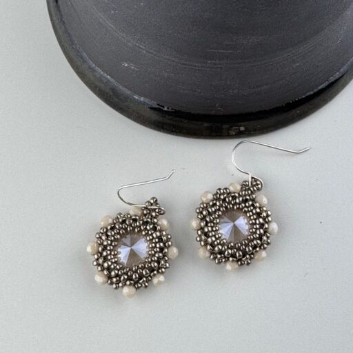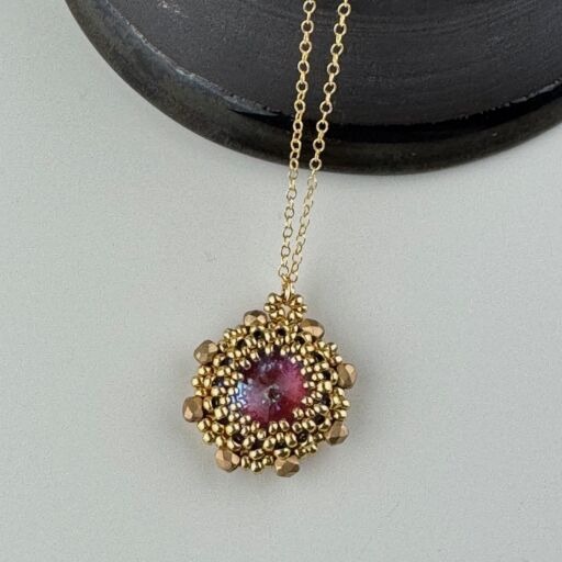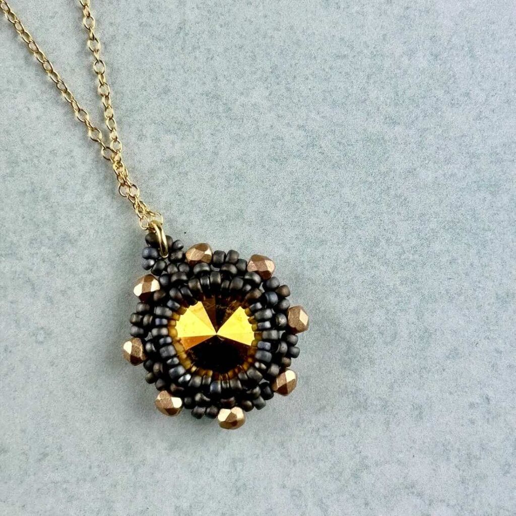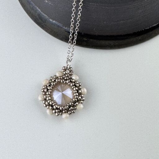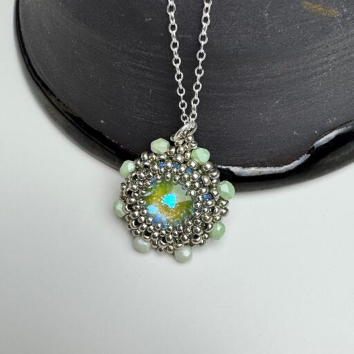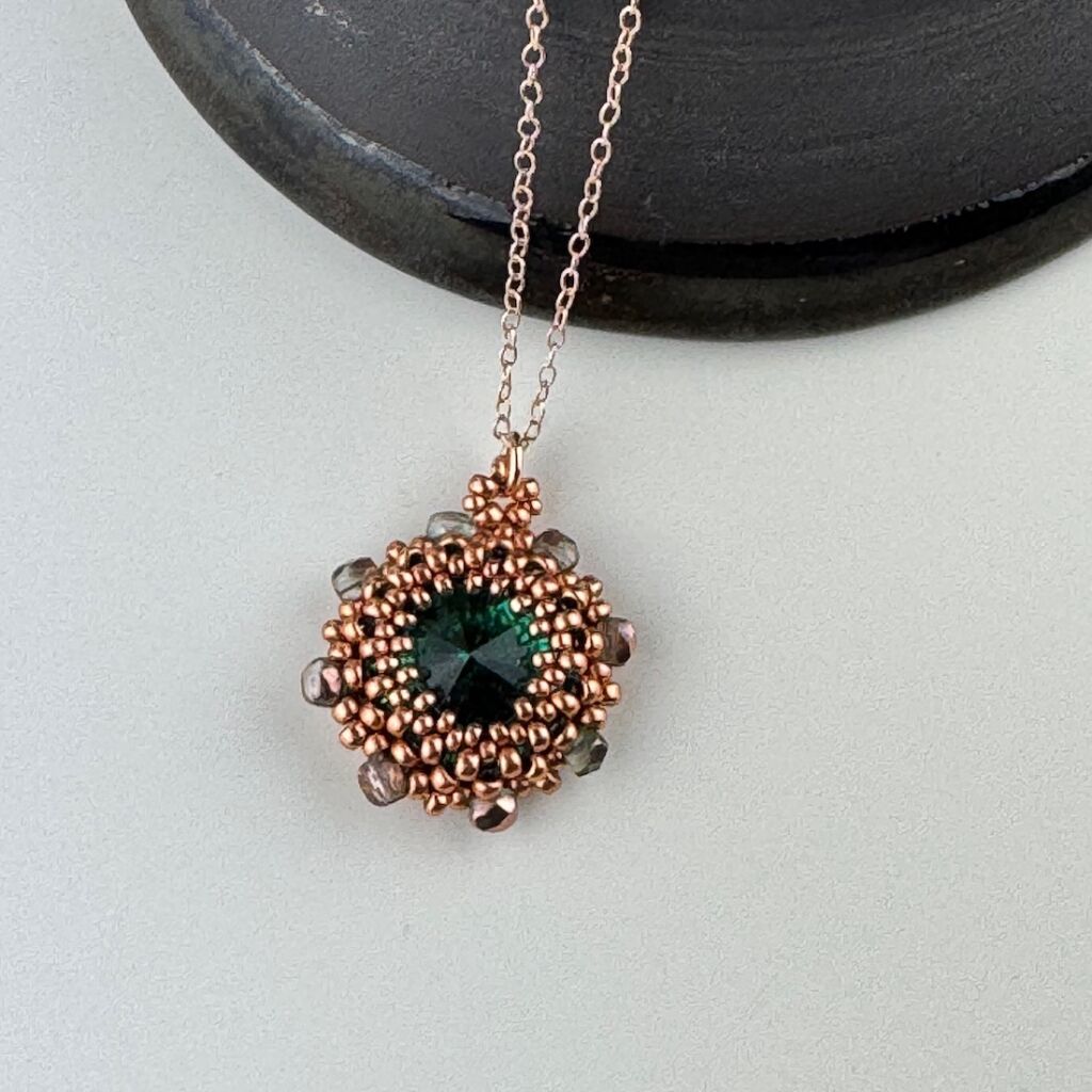 Boho style beadwoven pendant featuring a large crystal stone, surrounded with Japanese Seed Beads and Czech glass crystals.