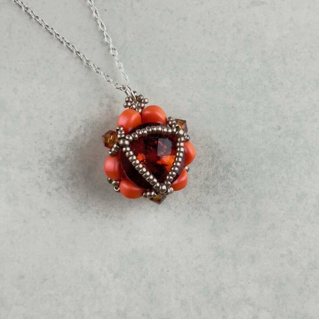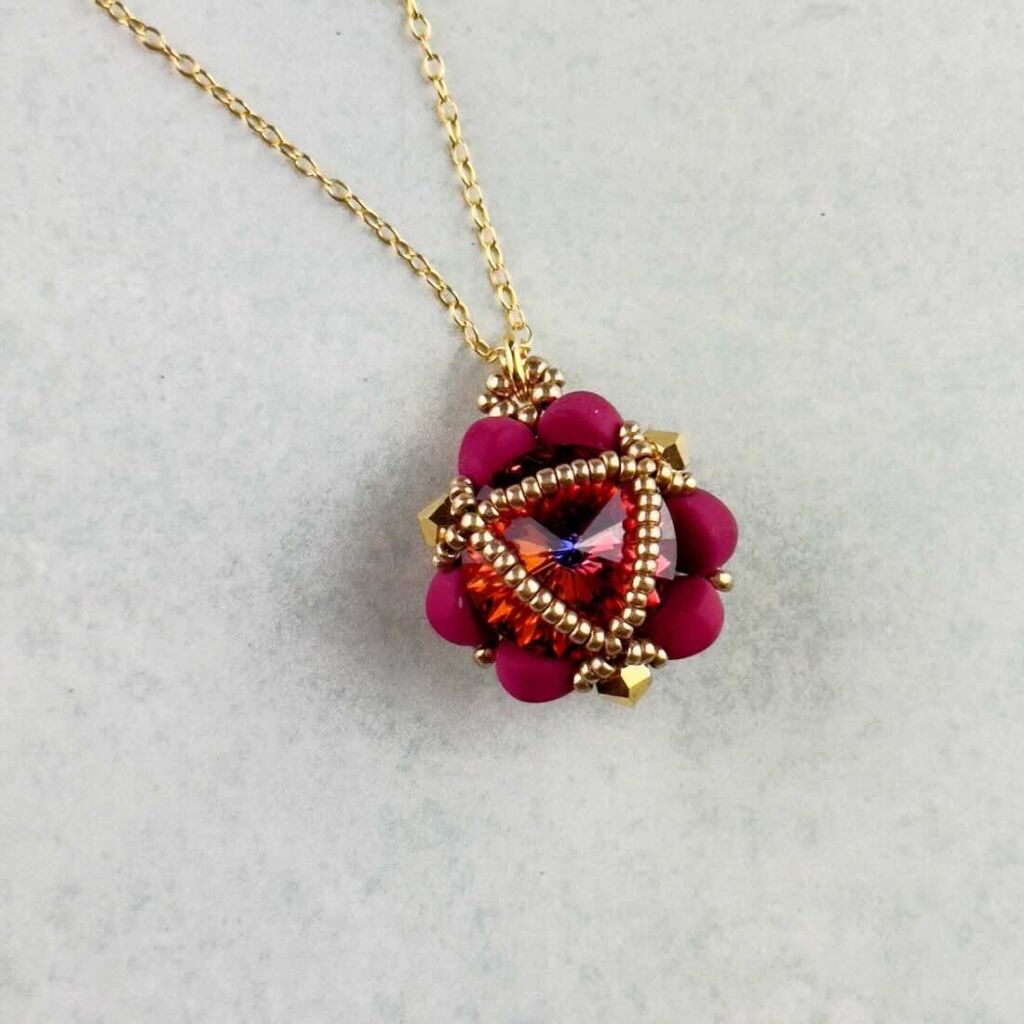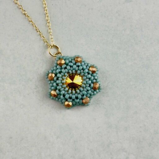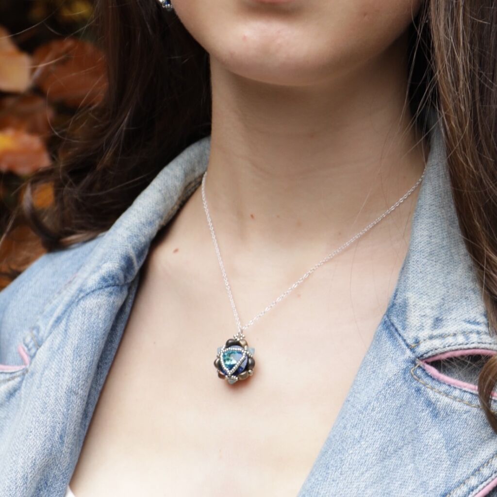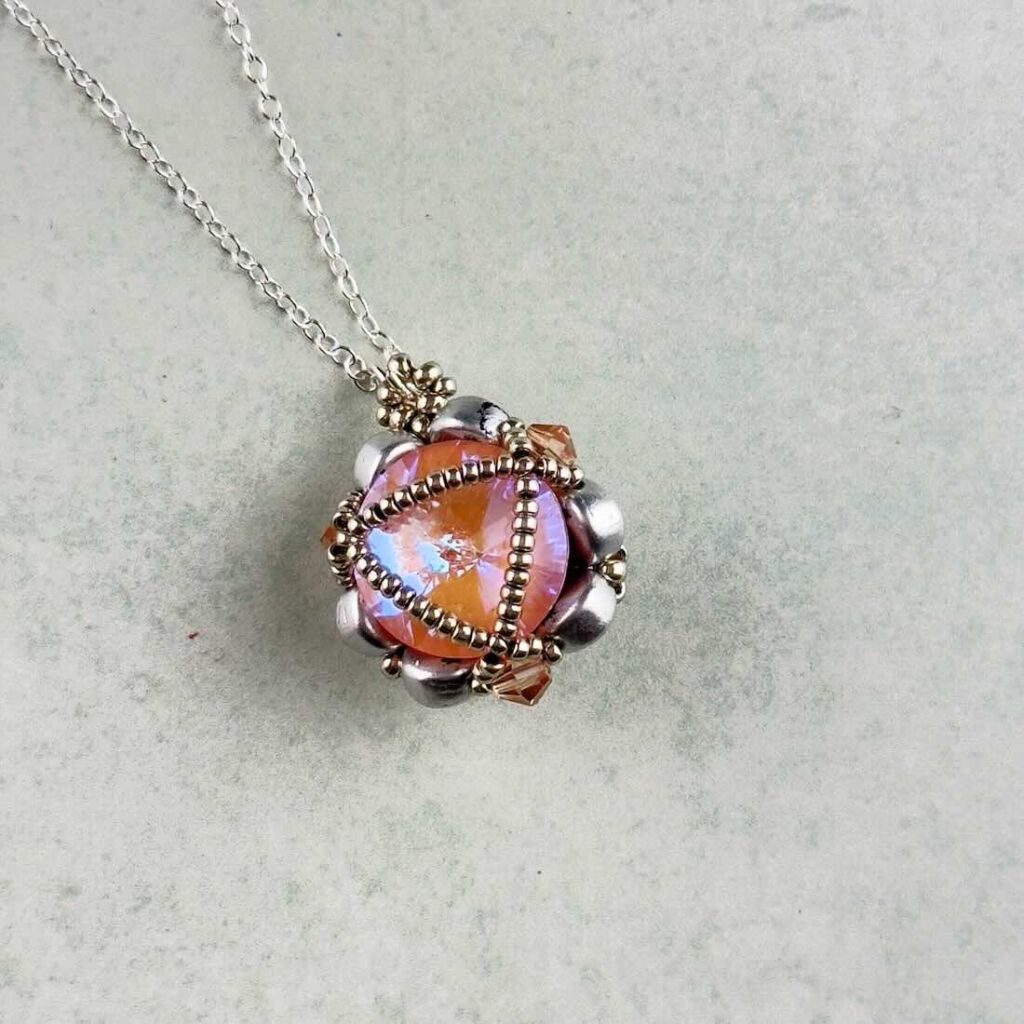 Unique beadwoven pendant featuring a large crystal centrepiece which is as pretty from the back as it is from the front, so can be worn either way round.