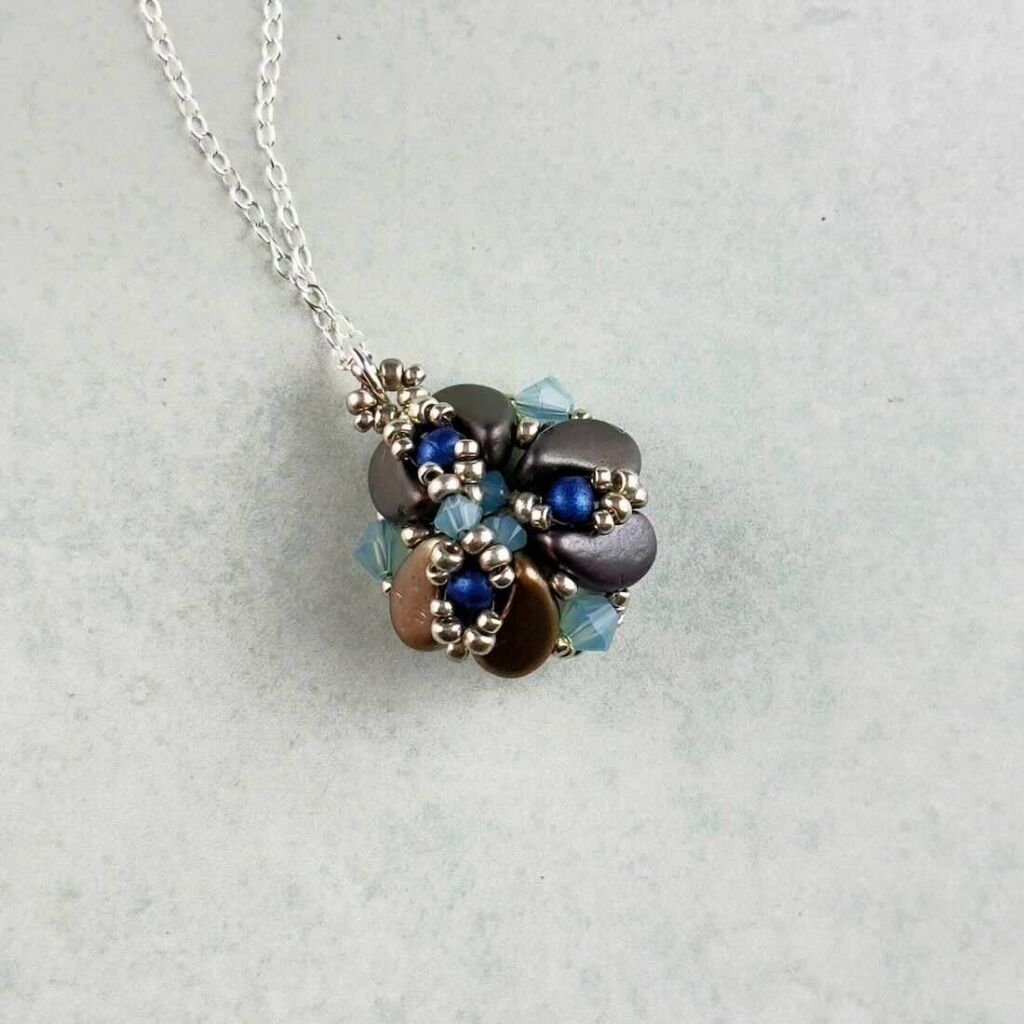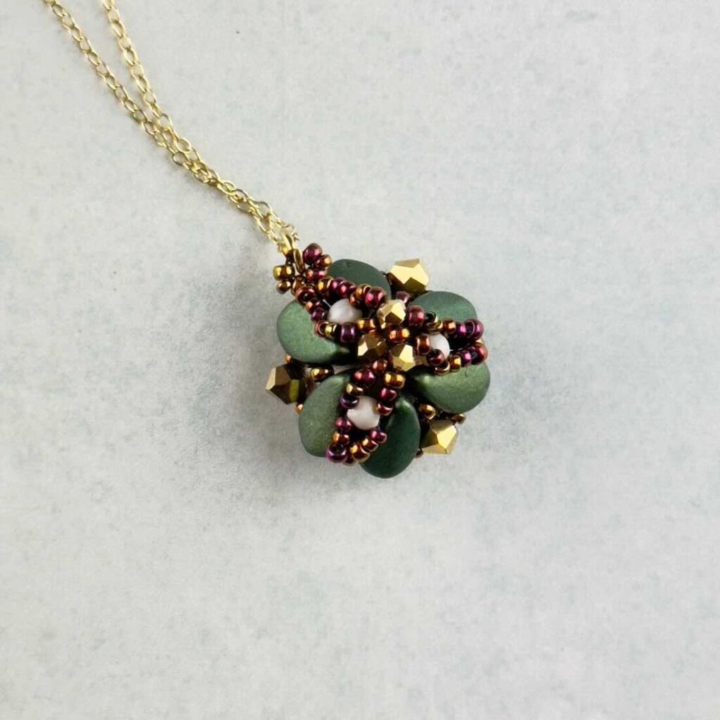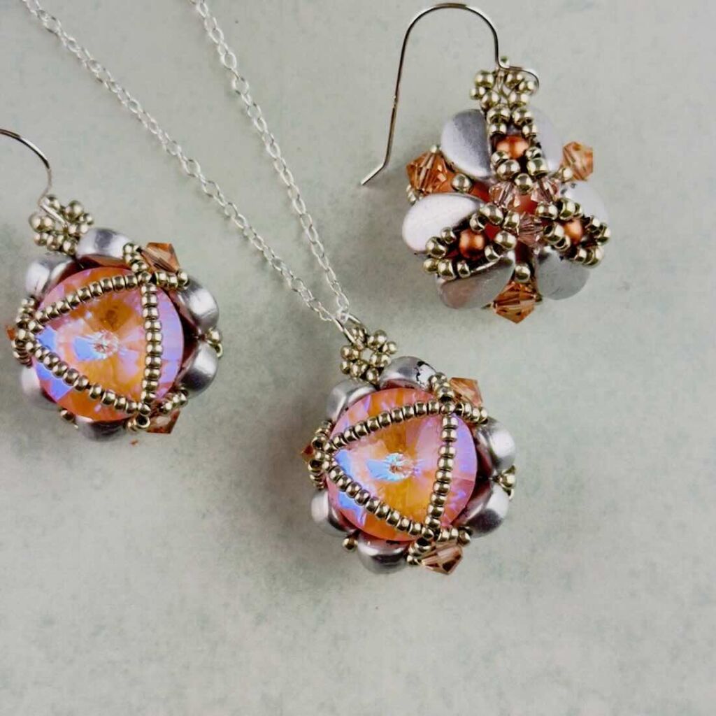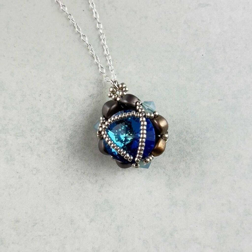 Unique beadwoven pendant featuring a large crystal centrepiece which is as pretty from the back as it is from the front, so can be worn either way round.