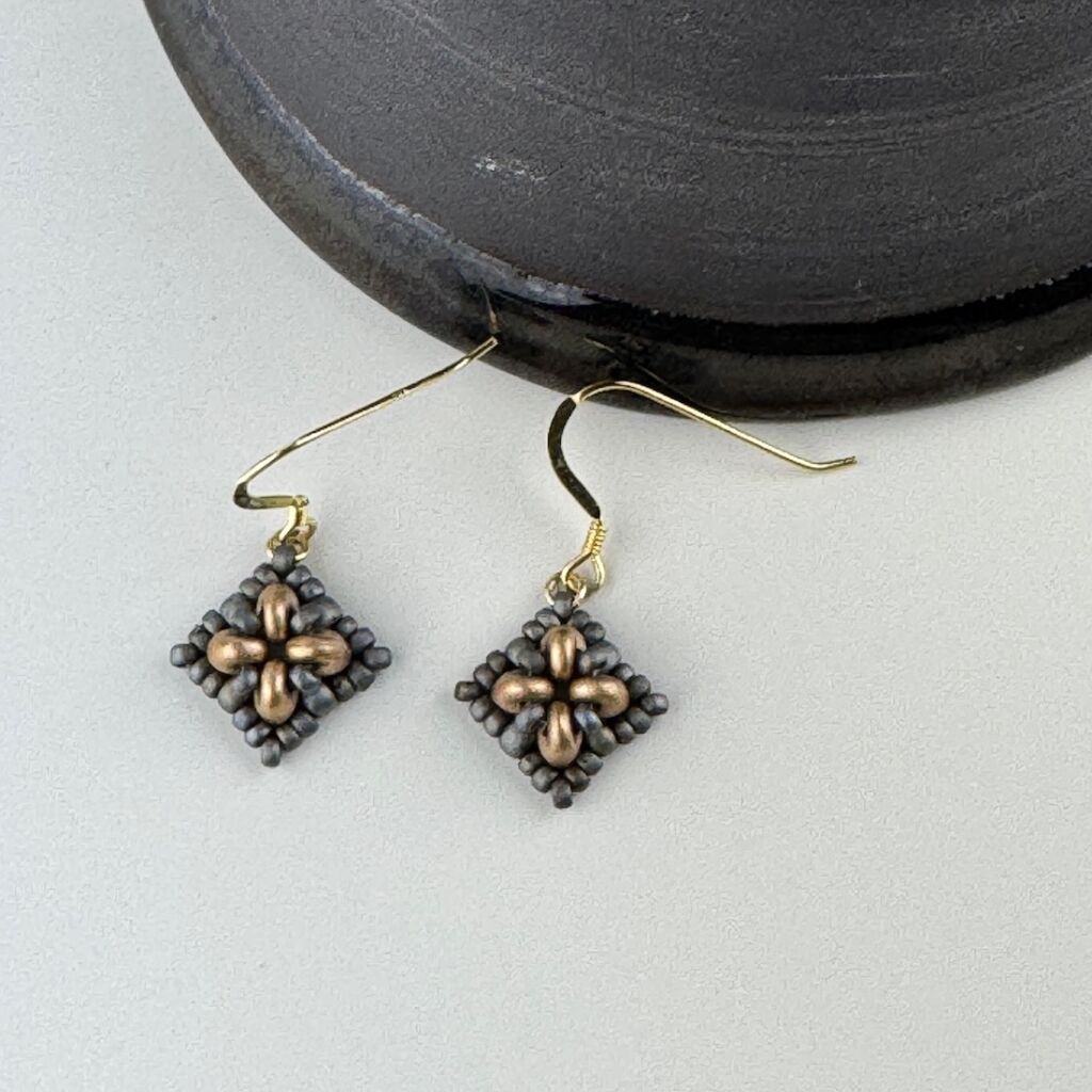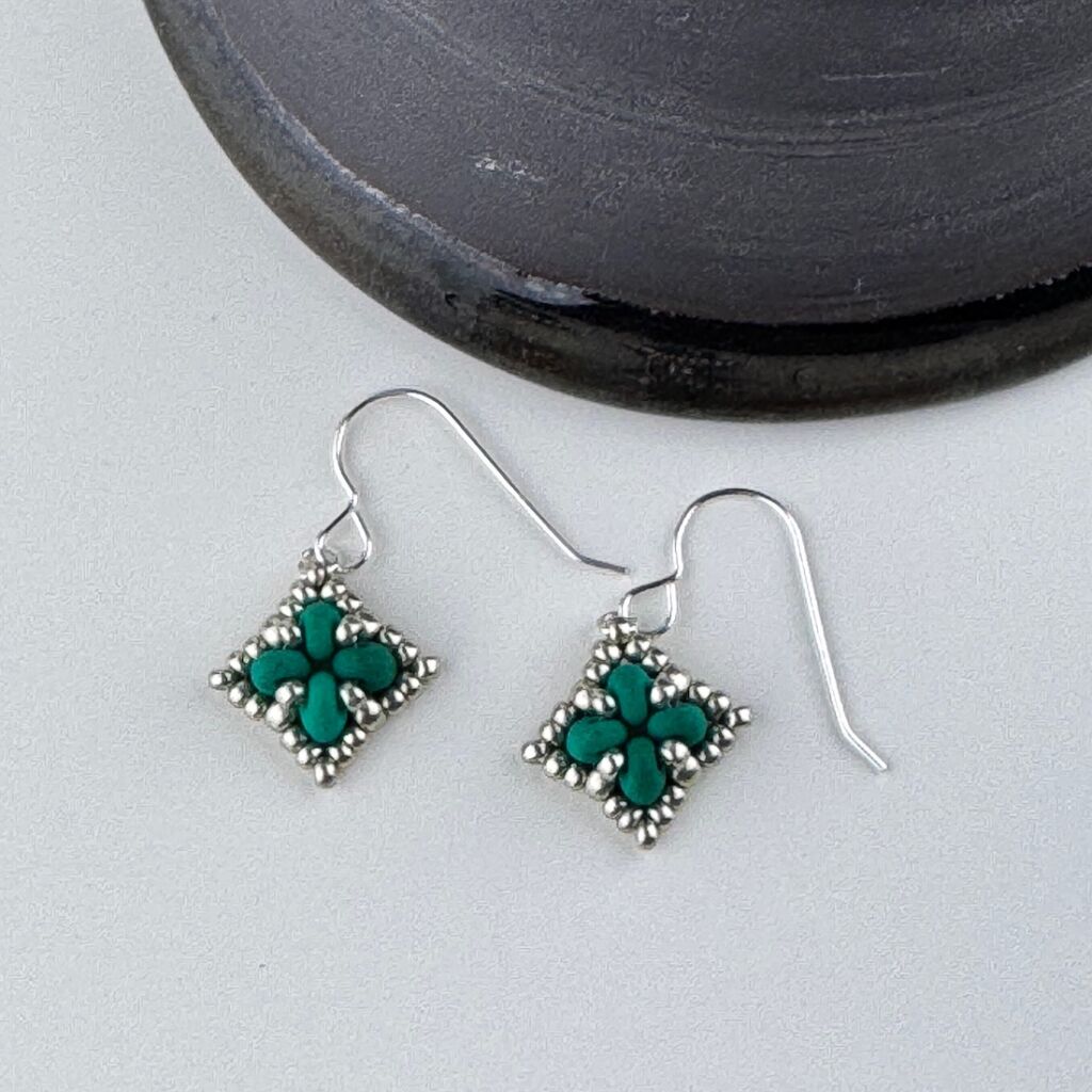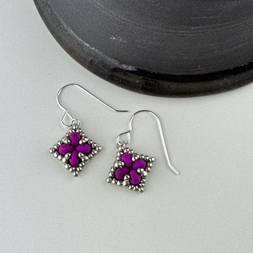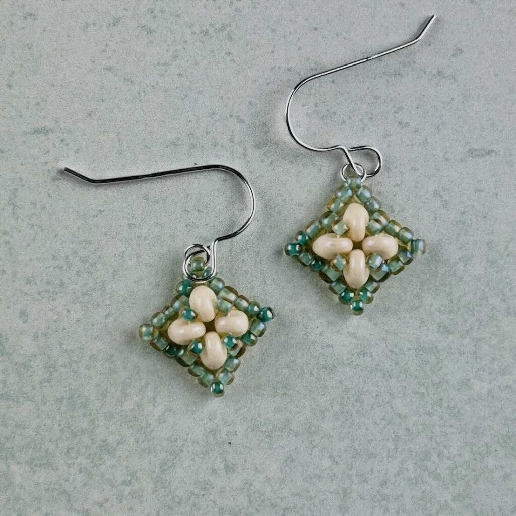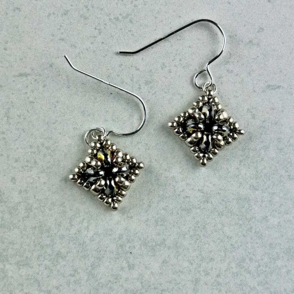 Simple beadwoven earrings in a square design with raised texture.