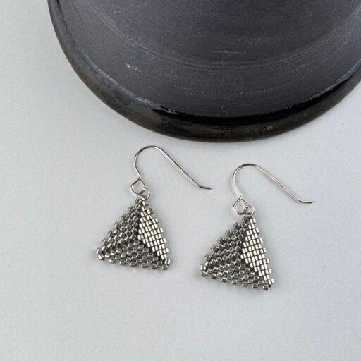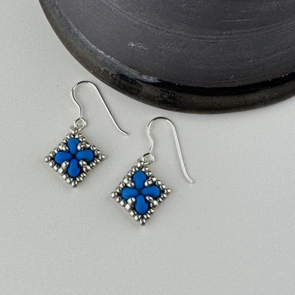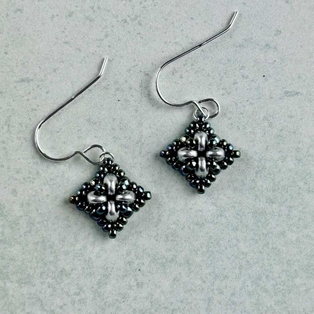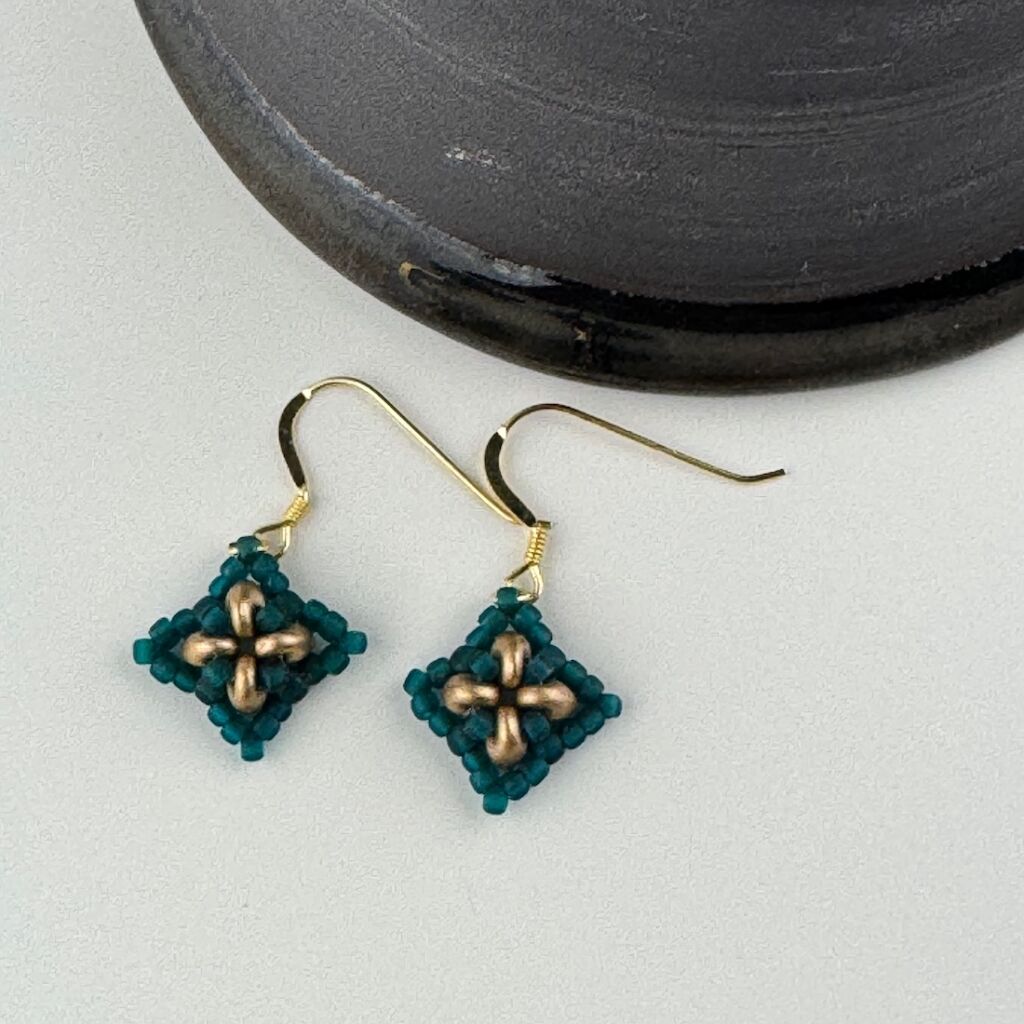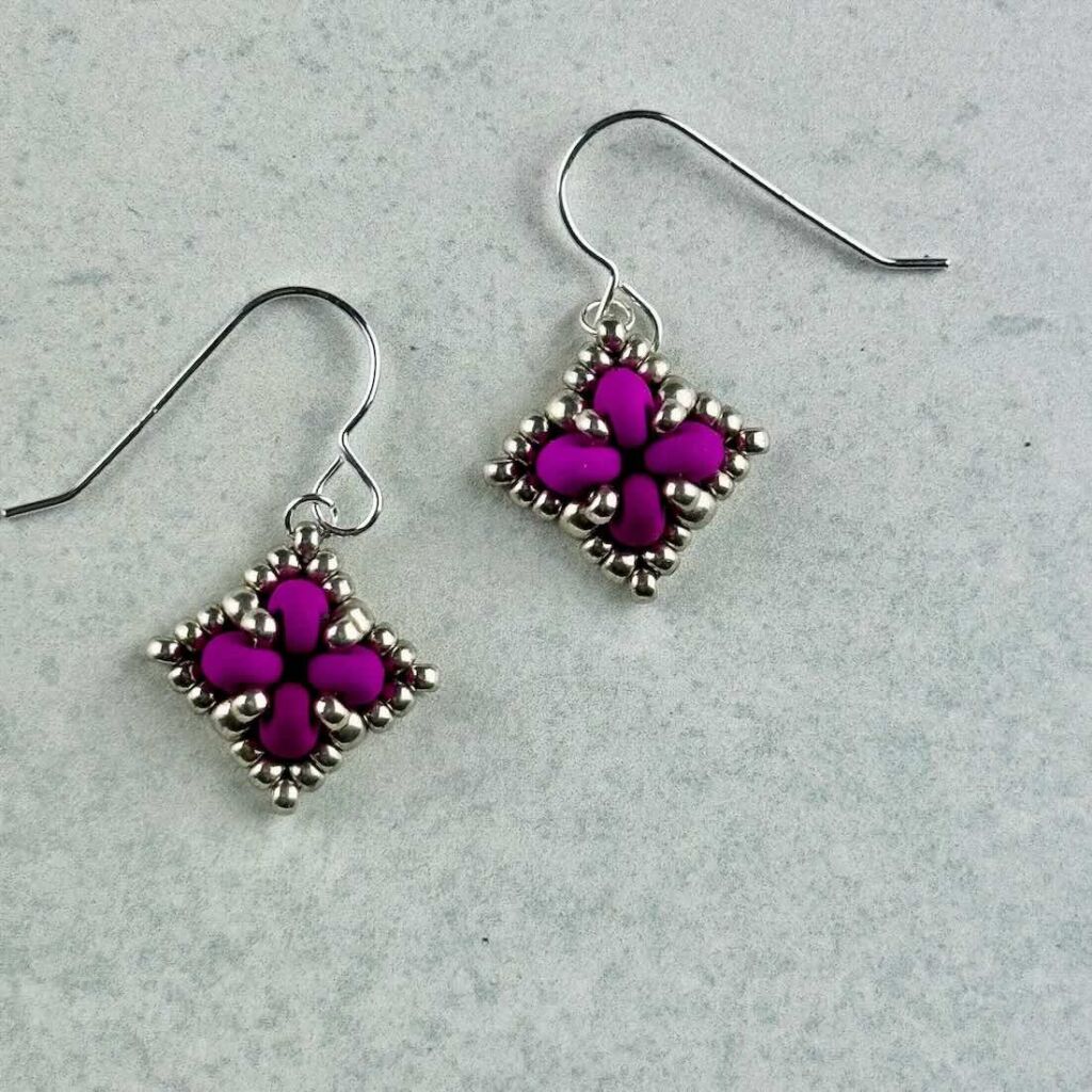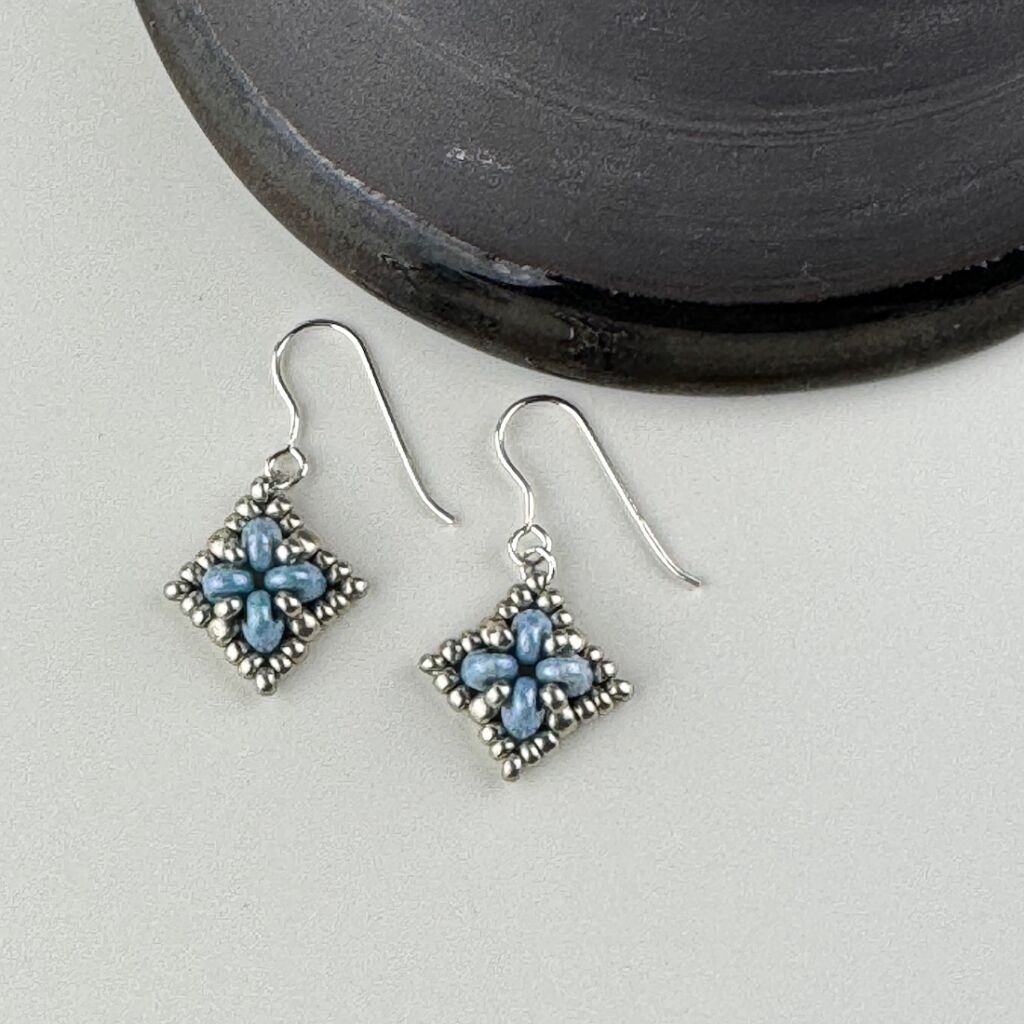Simple beadwoven earrings in a square design with raised texture.