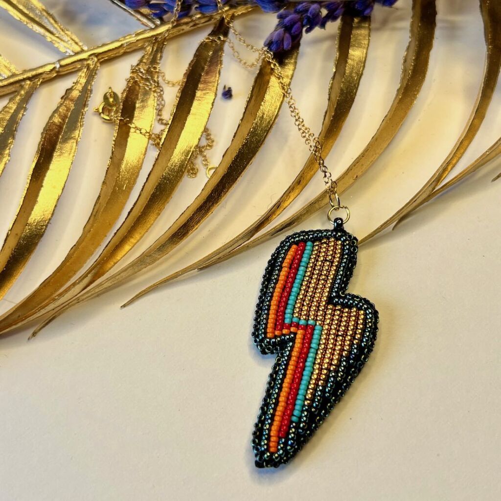 Striking bead embroidered lightning bolt pendant. Be bold and unique!